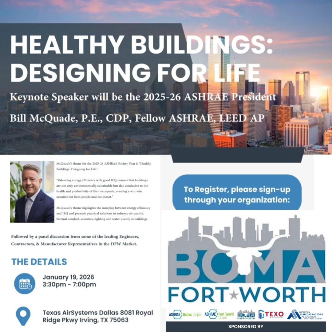 Join us for a joint meeting featuring ASA, BOMA, TEXO, and ASHRAE. The program will begin with a keynote presentation by Bill McQuade, P.E., CDP, Fellow ASHRAE, LEED AP, followed by a dynamic panel discussion with leading engineers, contractors, and manufacturing representatives from the DFW market. This session is FREE and open to BOMA Fort Worth engineers and property managers. Registration is required and space is limited. Registration closes at 11:59 PM on January 9, 2026. No walk-ins will be accepted.